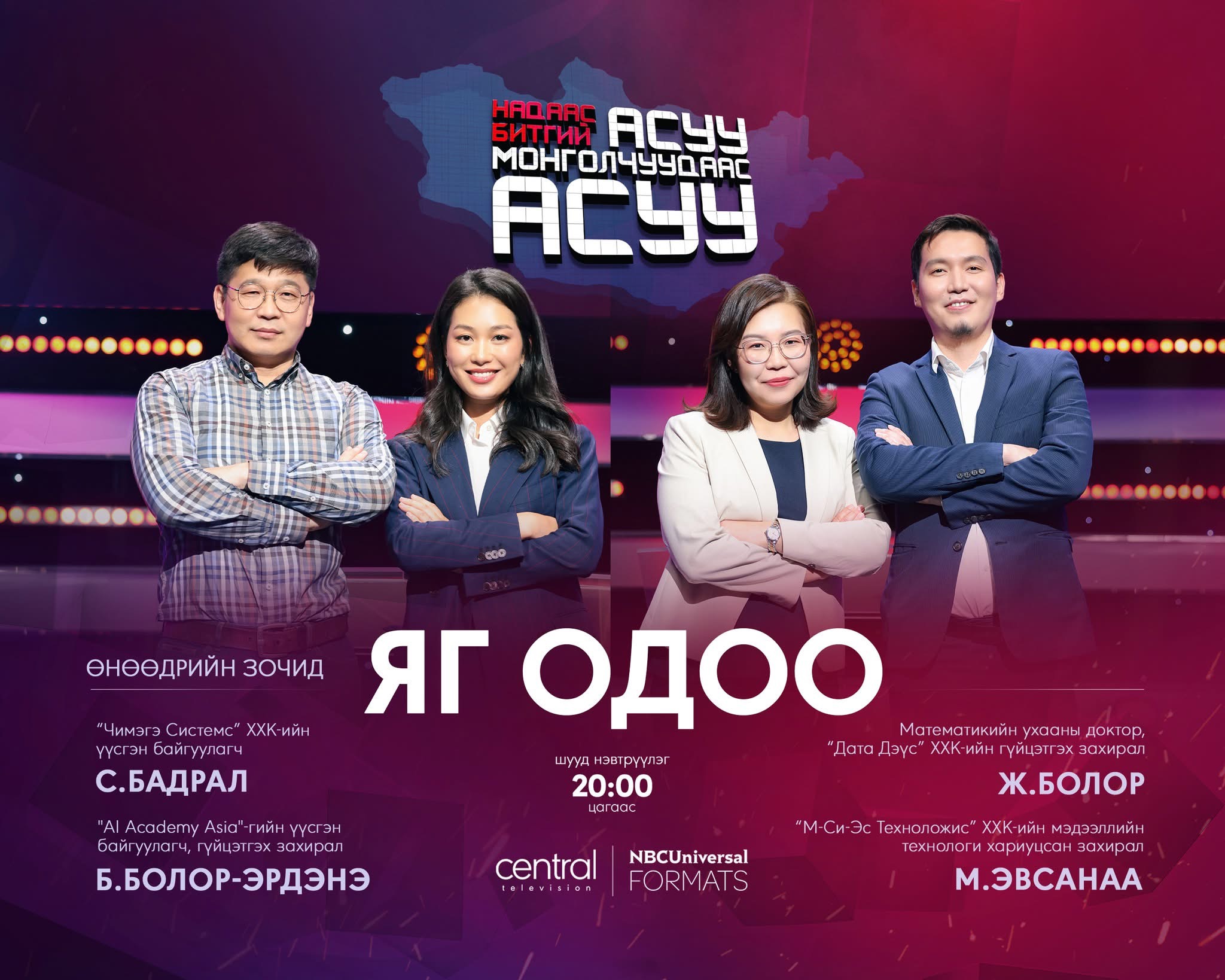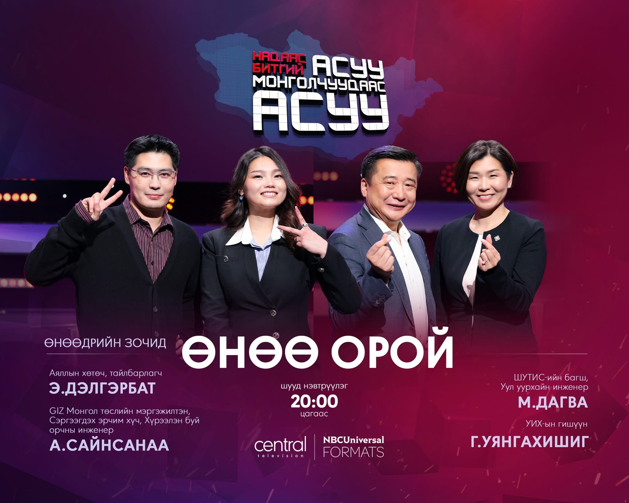 A bold, fast-paced, and entertaining interactive game show where the ultimate question is not “what do you think” — but “what do most Mongolians think?” Based on the hit international format Don't Ask Me, Ask Britain, this localized version puts Mongolia at the center of curiosity. Through live polls and real-time public opinions, the show dives into topics big and small — from culture, relationships, and lifestyle to taboo debates and trending questions. Two celebrity teams go head-to-head, trying to predict the majority opinion of the Mongolian public. Hilarious moments, surprising answers, and a mirror to what Mongolia is really thinking — this is the show where public opinion takes the spotlight.
